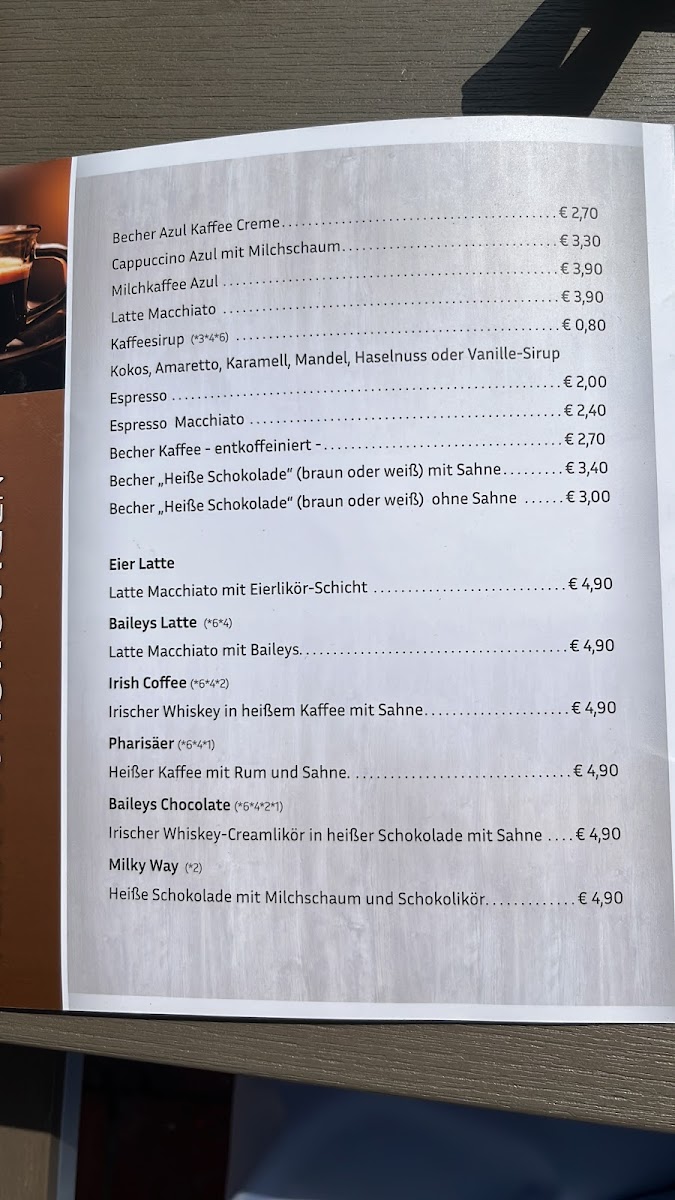 This combination of drinks and light food items makes the menu well-suited for visitors seeking refreshments during the day, whether for a quick order or a relaxed pause. The offerings support a variety of tastes with an emphasis on traditional German café fare and popular beverages.