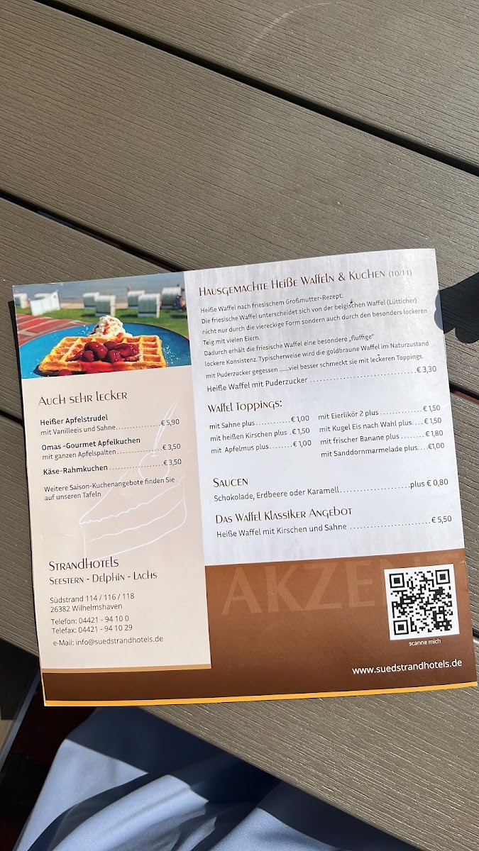 The menu at Café im Strandhotel Delphin offers a variety of options suitable for coffee breaks, light meals, and casual dining. Visitors can expect a selection of beverages including coffee specialties like cappuccino, as well as alcoholic drinks such as Aperol Spritz and local beers like Jever and Altbierbowle.